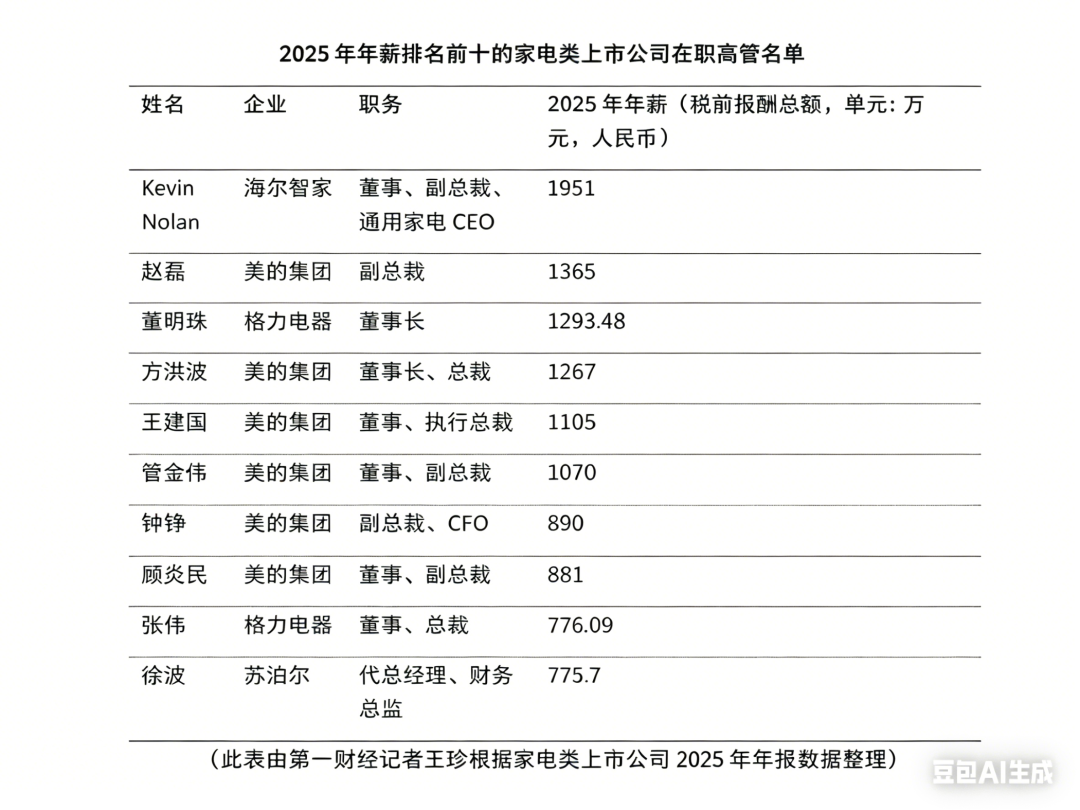4月30日,据中国A股家电类上市公司2025年年报,第一财经记者梳理出2025年年薪(税前薪酬总额,没计算激励股权)前十家电类上市公司高管名单,其中,海尔智家(600690.SH)董事、副总裁、旗下通用家电总裁兼首席执行官(CEO)Kevin Nolan排首位,美的集团(000333.SZ)的高管占了六席,格力电器(000651.SZ)董事长董明珠排第三,苏泊尔(002032.SZ)的高管也有上榜。